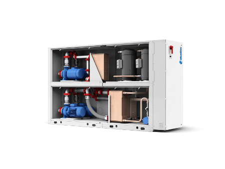 3-Wege-Modulierventil, mittels Frequenzumformer gesteuerter Pumpe auf der Quellenseite und einer fortgeschrittenen Software zur Verwaltung der Anlage und des getrennt aufgestellten Luft-Wärmetauschers.